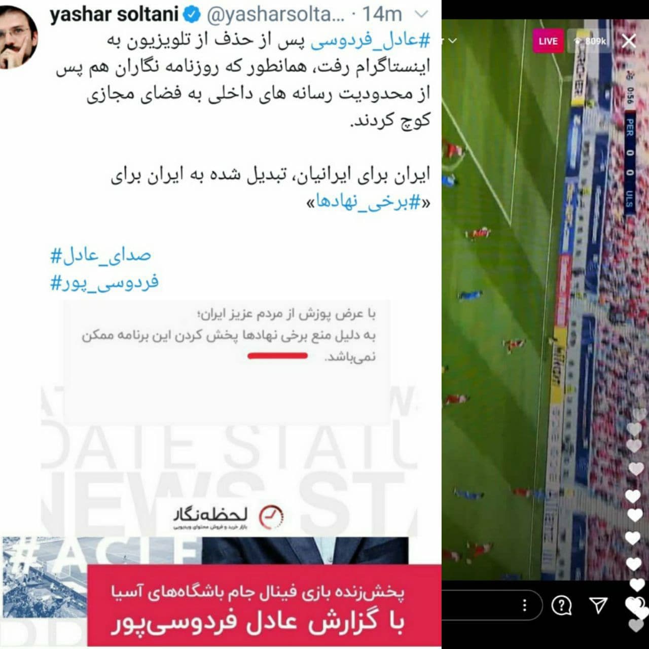 یاشار سلطانی نوشت: گزارش لایو عادل فردوسیپور در اکانت اینستاگرام AFCفارسی با ۸۰۹هزار بیننده پنجمین لایو پربیننده دنیا شد؛ پربینندهترین لایو فارسی.