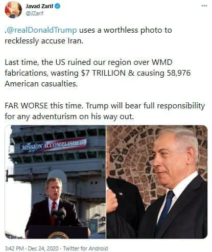 دفعه قبل، ایالات متحده با ادعای ساختگی تسلیحات کشتار جمعی منطقه ما را نابود کرد، ۷ تریلیون دلار به باد داد و موجب تلفات ۵۸۹۷۶ آمریکایی شد.