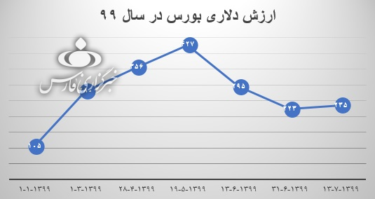 اما در سال ۱۳۹۹ که تعدد کدهای بورسی صادر شده به یکباره شیب تندی به خود گرفت، ارزش دلاری بورس نیز شیب زیادی گرفت و به یک رکورد در سال های گذشته دست یافت.