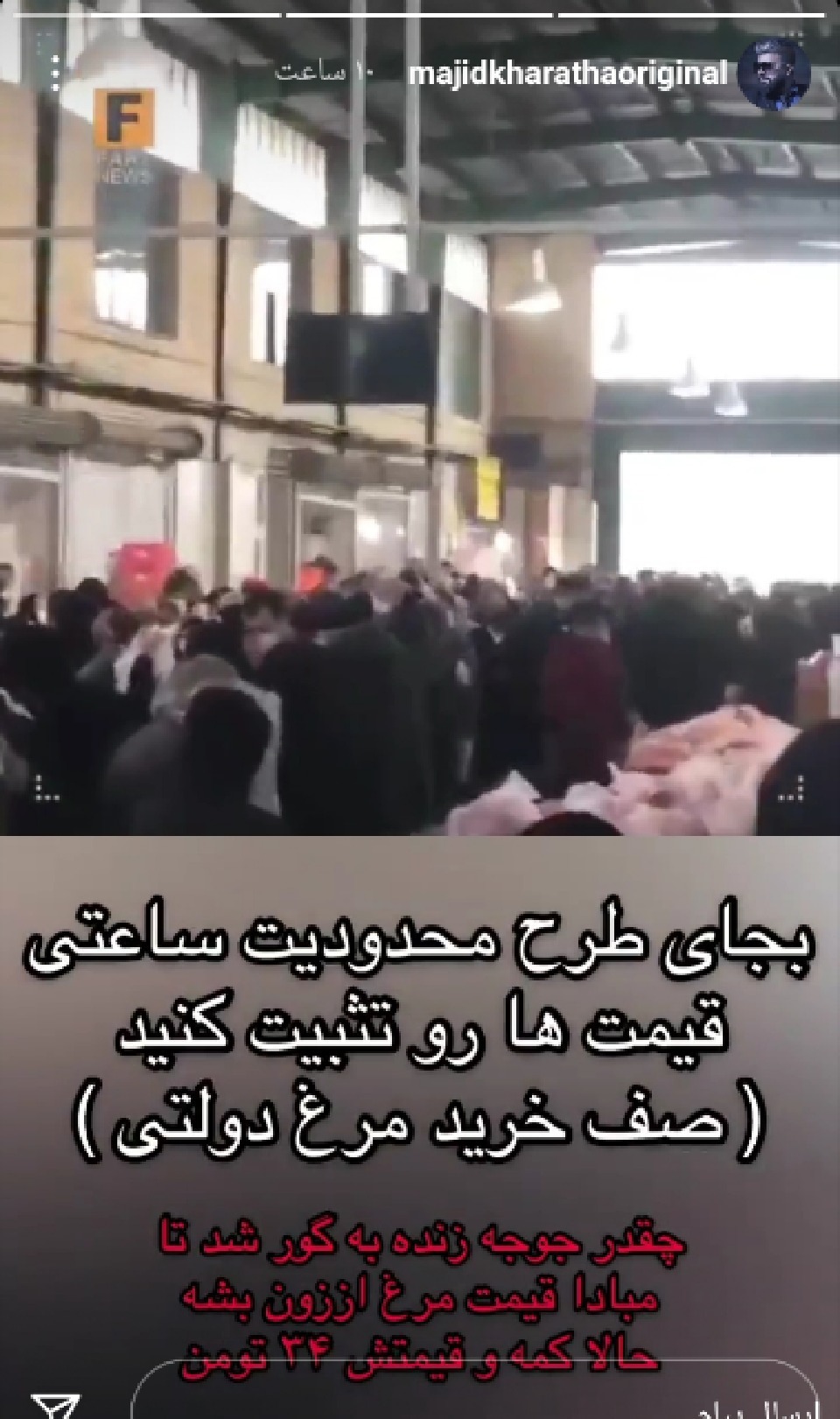مجید خراطها، خواننده موسیقی پاپ در واکنش به افزایش قیمت مرغ و صفهای فشرده و طولانی برای خرید آن در دوران قرنطینه، استوری ای را در صفحه اینستاگرامش به اشتراک گذاشت. ..منبع : خبرفوری