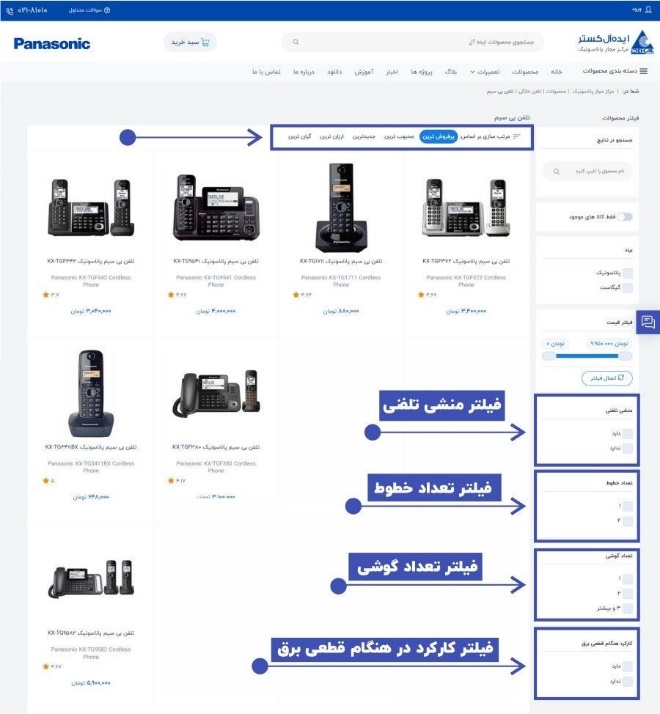 در صورت تمایل میتوانید تلفنهای بیسیم پاناسونیک را در وب سایت ایده آل گستر، بر اساس قابلیتهایی از قبیل منشی تلفنی، تعداد خطوط، تعداد گوشی بیسیم و کارکرد در هنگام قطعی برق نیز فیلتر کرده و سریعتر به محصول دلخواهتان دسترسی داشته باشید.